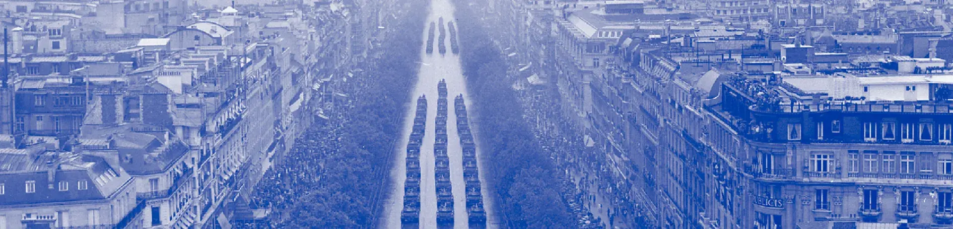 Photographie : Défilé des troupes sur les Champs-Élysées vu depuis l’Arc de Triomphe. 14 juillet 1968. Source : Ministère des Armées.